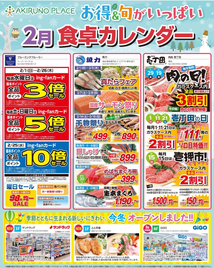 2026.01.28 【1/28号折込チラシ】お得&旬がいっぱい 2月の食卓カレンダー 1/28(水)号の折込チラシを掲載します! 食品3店舗の2月のお得な情報を発信!また新しくオープン&リニューアルオープンの店舗もご紹介♪ チラシ情報はこちら
